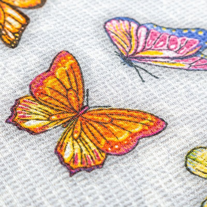 Качественная натуральная хлопчатобумажная ткань, обладающая высокой гигроскопичностью, с яркими бабочками на светло-сером фоне. Универсальный материал, из которого шьют кухонные полотенца, скатерти, прихватки, салфетки.