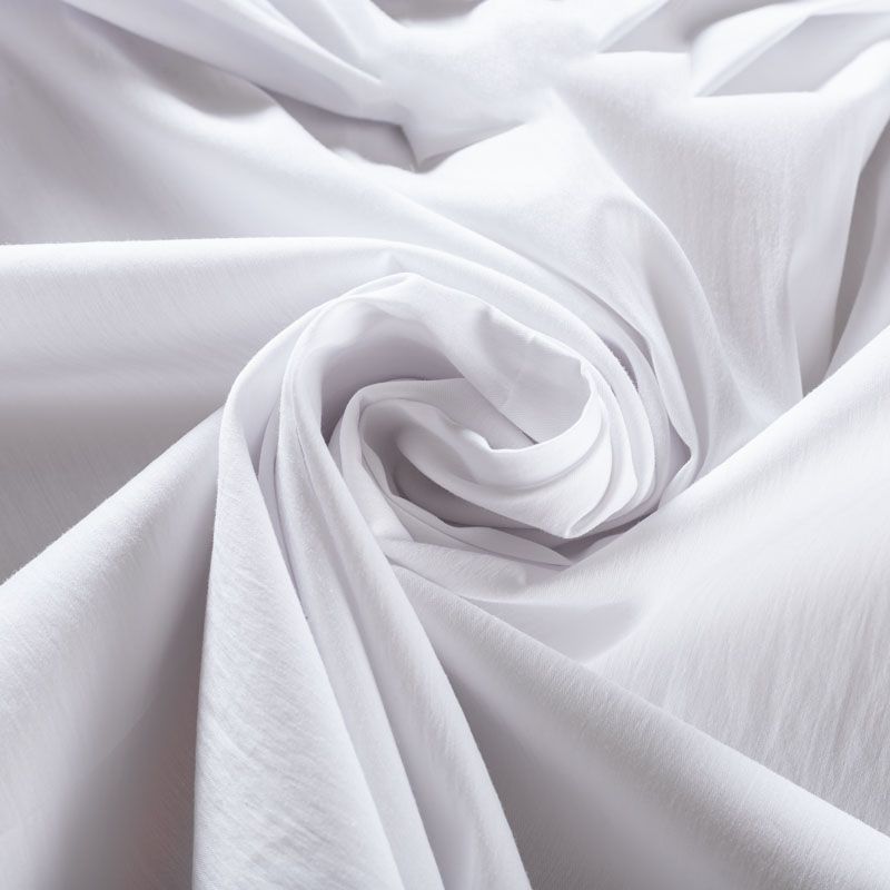 Однотонный плательно-рубашечный хлопковый поплин белого оттенка. Ткань лёгкая, слегка прозрачная, поверхность матовая, гладкая, приятная к телу, хорошо драпируется, тянется за счет эластана в составе. Прекрасно подойдет блузы, платья-рубашки, летнего сарафана, туники.