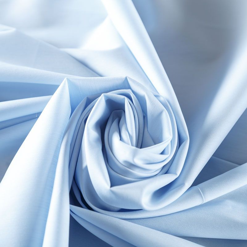 Однотонный плательно-рубашечный смесовый поплин светло-голубого оттенка. Ткань лёгкая, слегка прозрачная, поверхность матовая, гладкая, приятная к телу, хорошо драпируется, тянется за счет эластана в составе. Прекрасно подойдет блузы, платья-рубашки, летнего сарафана, туники.