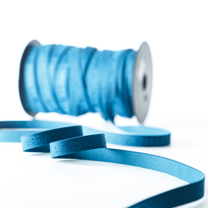 Бретелечная резинка используется для обработки стана бюстгальтера, а также для бретелей. Матовая с жаккардовой надписью бренда. Края ровные.