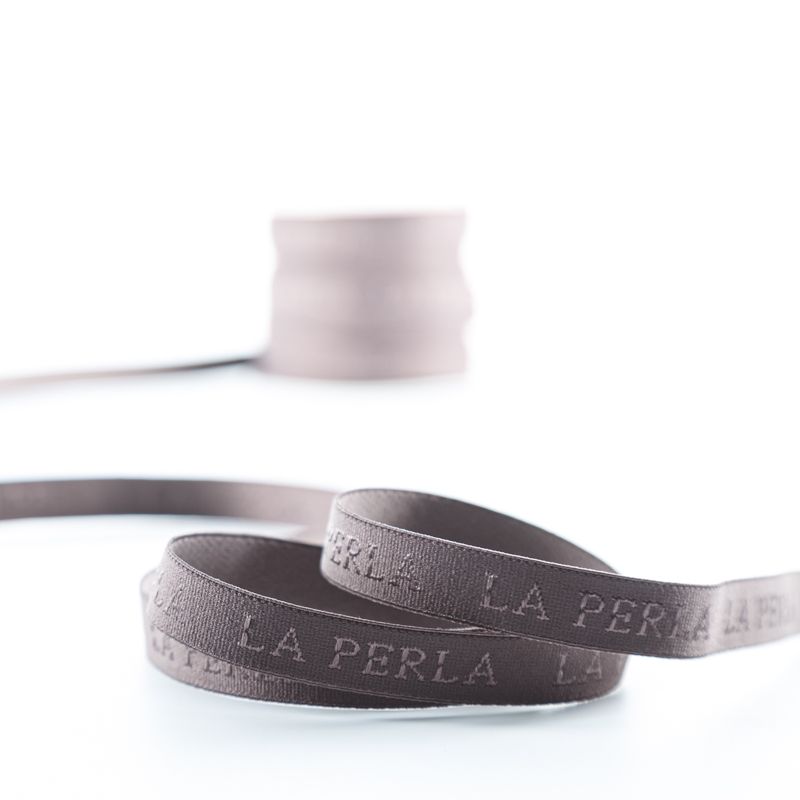 Бретелечная резинка используется для обработки стана бюстгальтера, а также для бретелей. Матовая с жаккардовой надписью бренда. Края ровные.