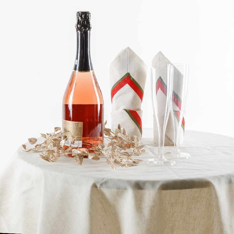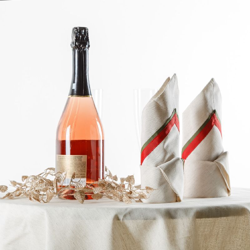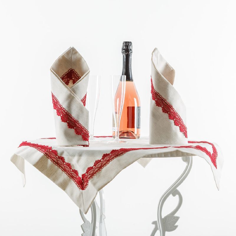 Декоративные сервировочные салфетки выполнены из смесовой хлопковой ткани натурального льняного оттенка и декорированы ажурной тесьмой бордового цвета. Комплект расчитан на 2 персоны, размер салфетки 40х40 см.