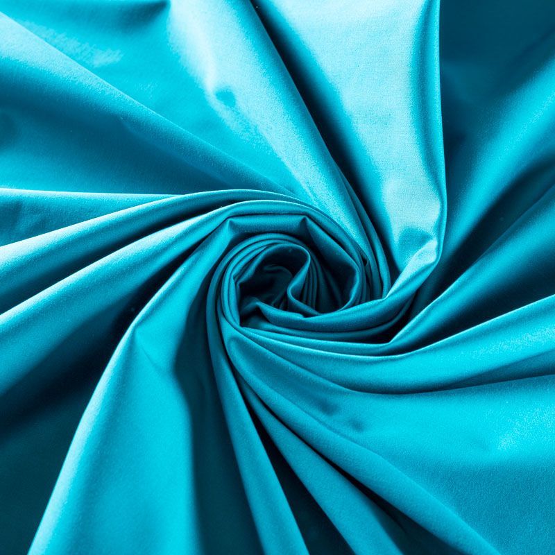 Итальянский сатин-коттон лазурно-голубого цвета. Поверхность гладкая со сдержанным блеском, ткань плотная, но не толстая, хорошо держит форму, тянется за счет эластана в составе. Подойдет для пошива костюма, жакета, юбки, платья, брюк или шорт.