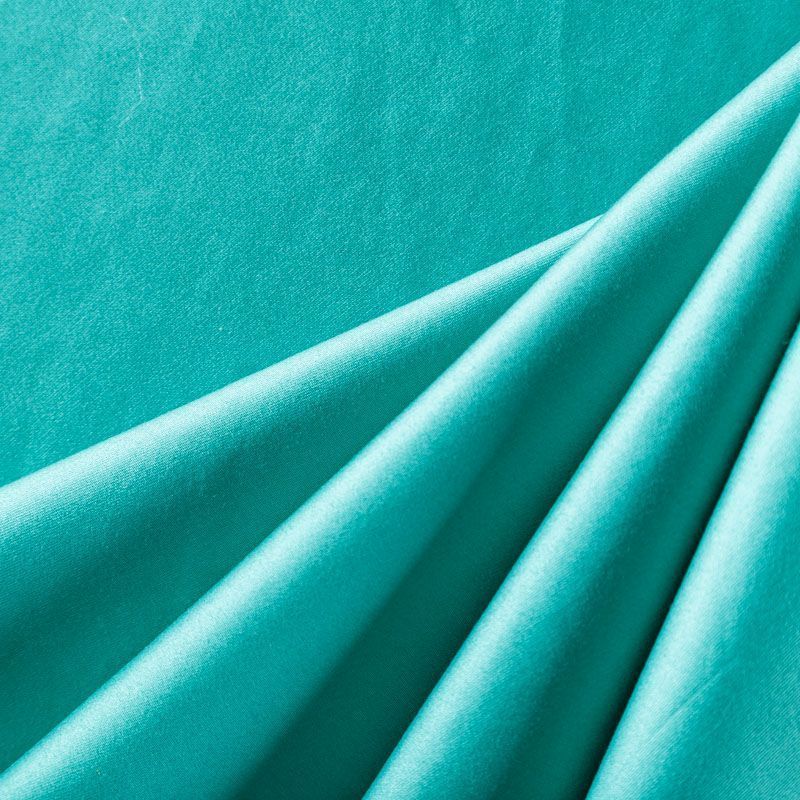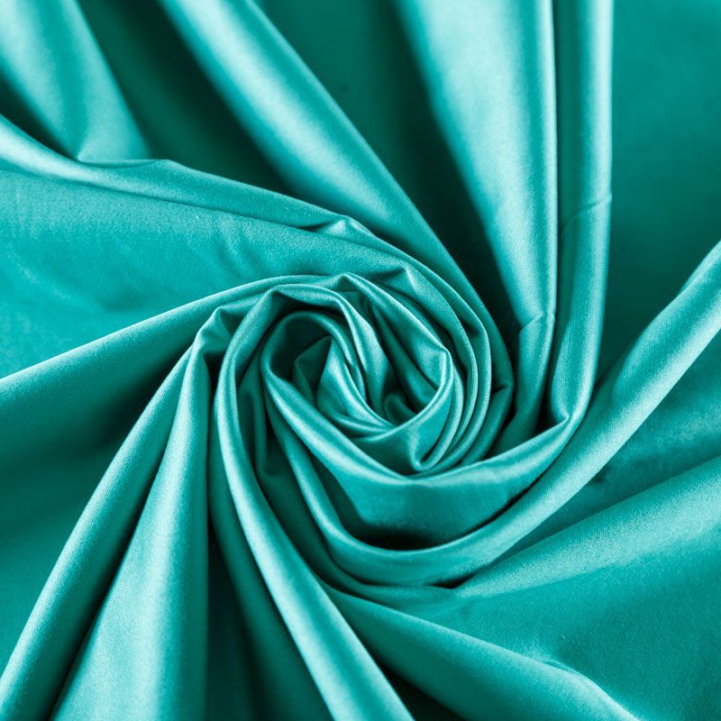 Коттон средней плотности зеленого оттенка, мягкий, приятный на ощупь, эластичный, держит форму, смотрится красиво. Имеет сатиновый лоск и плетение. Подойдет для пошива костюма, жакета, юбки, платья и других изделий на теплый и прохладный сезоны.