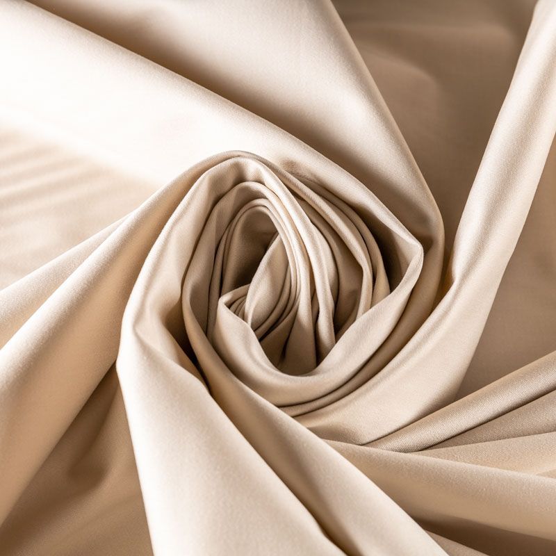 Поверхность гладкая со сдержанным блеском, ткань плотная, но не толстая, хорошо держит форму, тянется