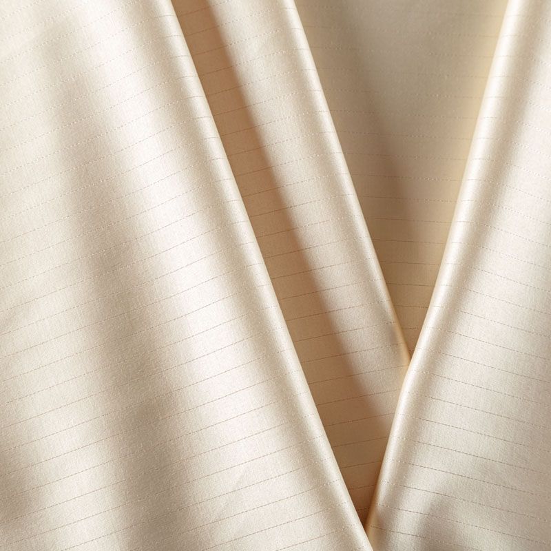 Сатин-коттон в бежевом оттенке с тонкими полосками люрексовой нити. Поверхность гладкая со сдержанным блеском, ткань средней плотности,  не толстая, хорошо держит форму, тянется за счет эластана в составе. Подойдет для пошива костюма, жакета, юбки, платья, брюк или шорт.