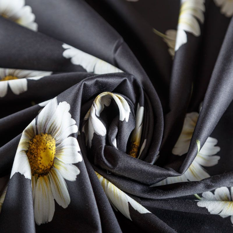 Итальянский сатин-коттон черного цвета с крупным цветочным принтом. Поверхность гладкая со сдержанным блеском, ткань средней плотности,  не толстая, хорошо держит форму, тянется за счет эластана в составе. Подойдет для пошива костюма, жакета, юбки, платья, брюк или шорт.