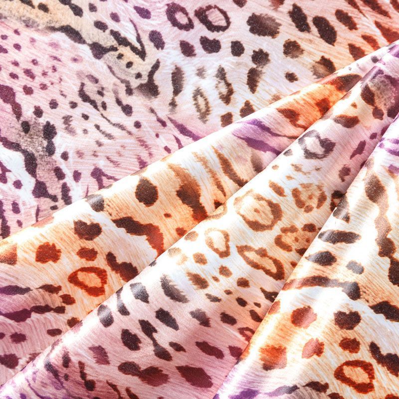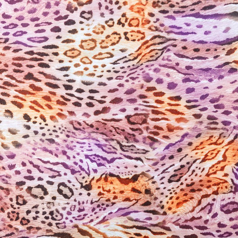 Сатин-коттон в сиреневом оттенке со стилизованным анималистическим принтом, с гладкой поверхностью со сдержанным блеском, ткань средней плотности,  не толстая, хорошо держит форму, тянется за счет эластана в составе. Подойдет для пошива костюма, жакета, юбки, платья, брюк или шорт.