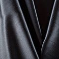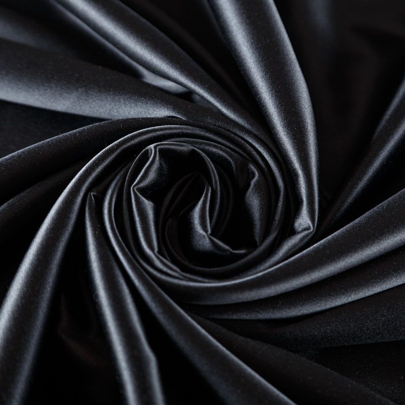 Сатин-коттон в черном цвете, с гладкой поверхностью со сдержанным блеском, ткань средней плотности,  не толстая, хорошо держит форму, тянется за счет эластана в составе. Подойдет для пошива костюма, жакета, юбки, платья, брюк или шорт.