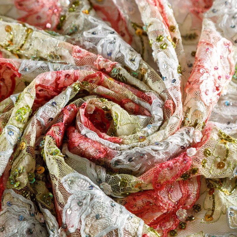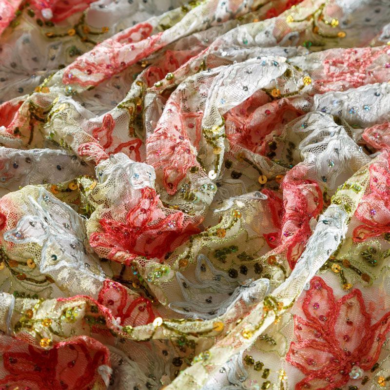 Итальянское полотно белого цвета с цветочным объемным узором, вышитом на тонкой сетке с мелкой ячейкой, сетка мягкая, пластичная, матовая, не держит форму. Дополнительно вышивка декорирована мелкими глянцевыми пайетками. Прекрасно подойдет для вечерних платьев, юбок, топов, бюстье. Эффектно смотрится на теле без подкладочной ткани, например, рукава платья.