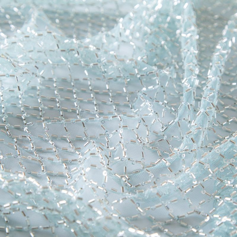 Эластичная мягкая сетка мятного оттенка, расшитая прозрачным стеклярусом. Геометрический дизайн делает полотно универсальным в использовании. Итальянская сетка прекрасно подходит для пошива праздничных нарядов, платьев, юбок и топов для торжественных случаев, а также отделки аксессуаров.