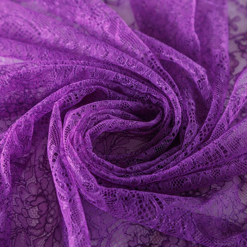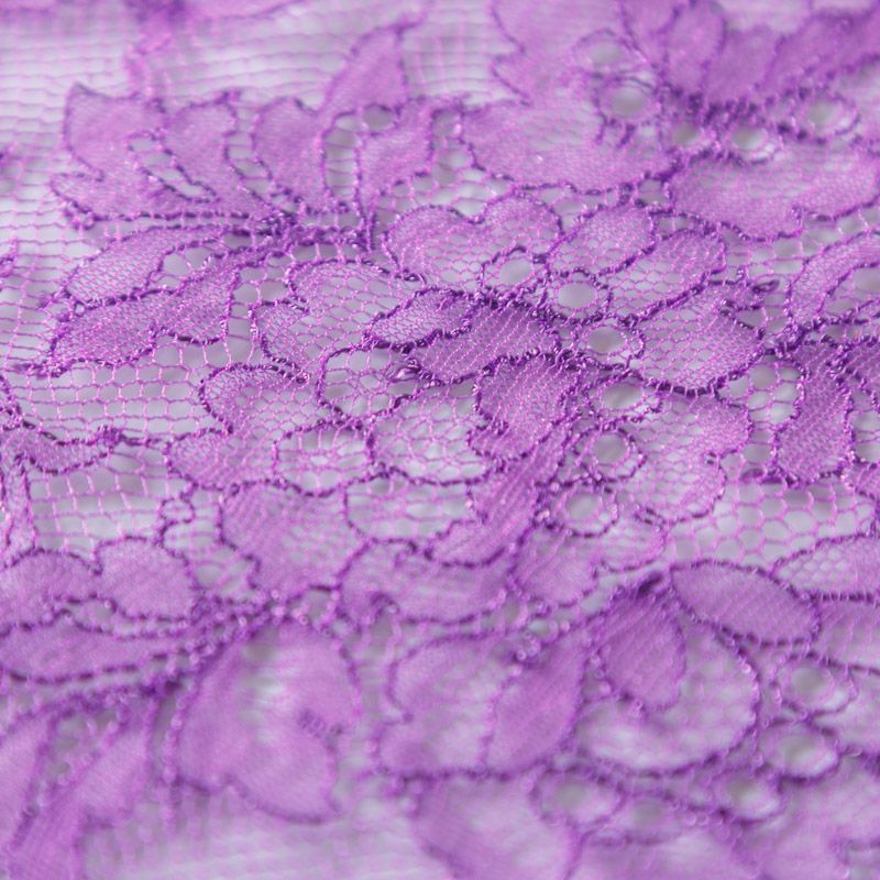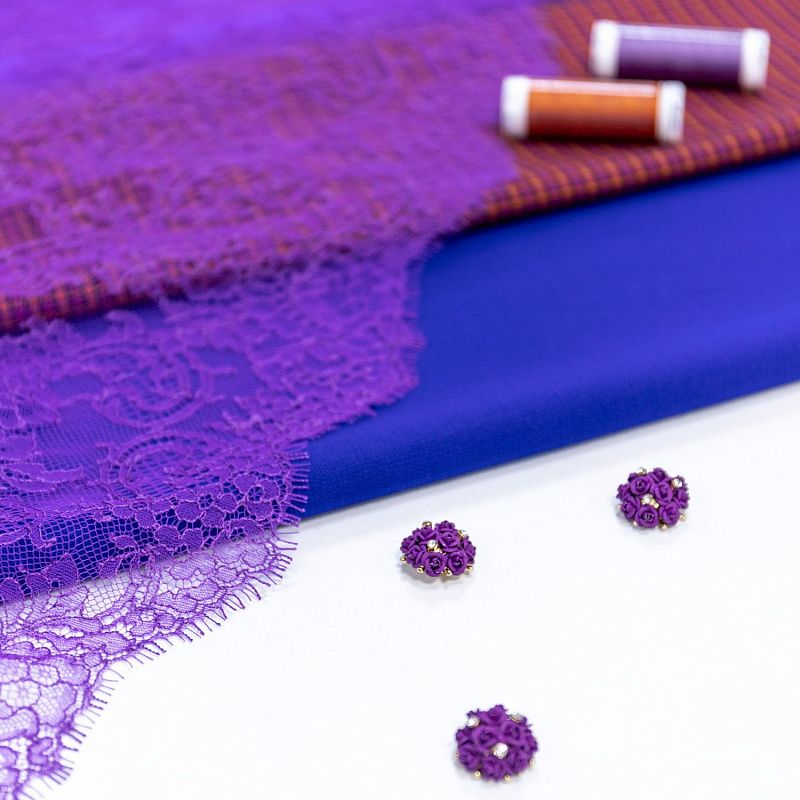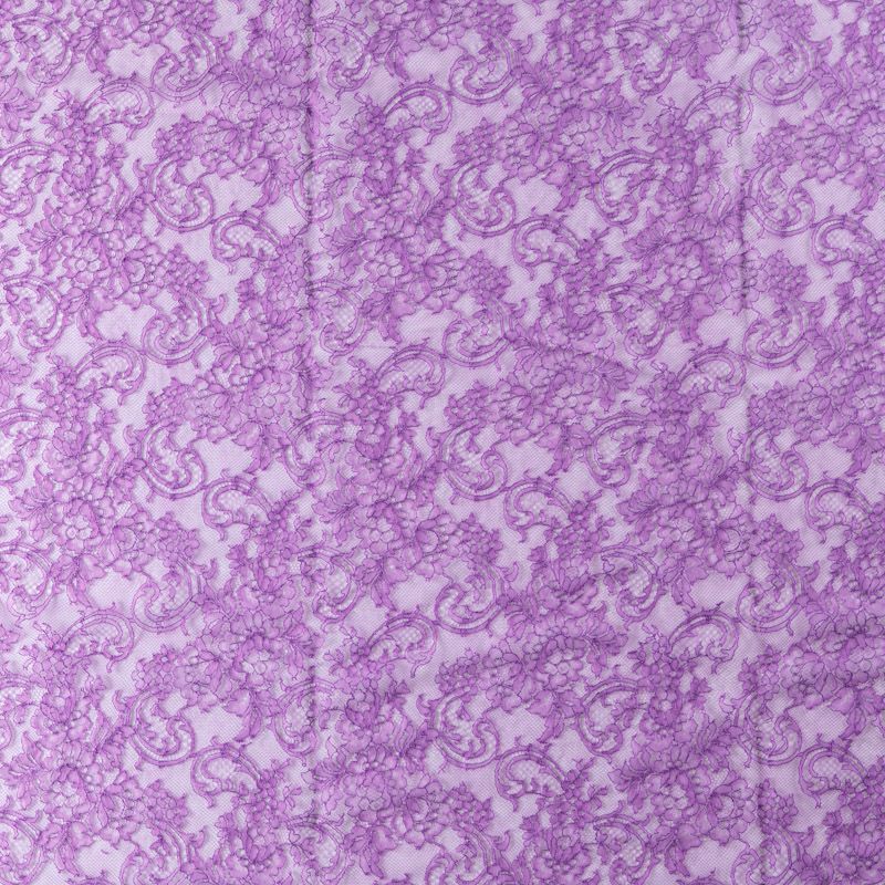 Французское шантильи фиалкового оттенка имеет тончайшее плетение волокон и состоит из нежнейшего кружева, которое используется для пошива свадебных нарядов, праздничных платьев. Вставки из кружева украсят любой офисный костюм, повседневное платье, юбку, блузу. Обе кромки кружева украшены фигурными фестонами.
