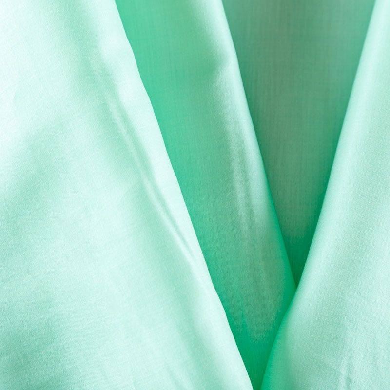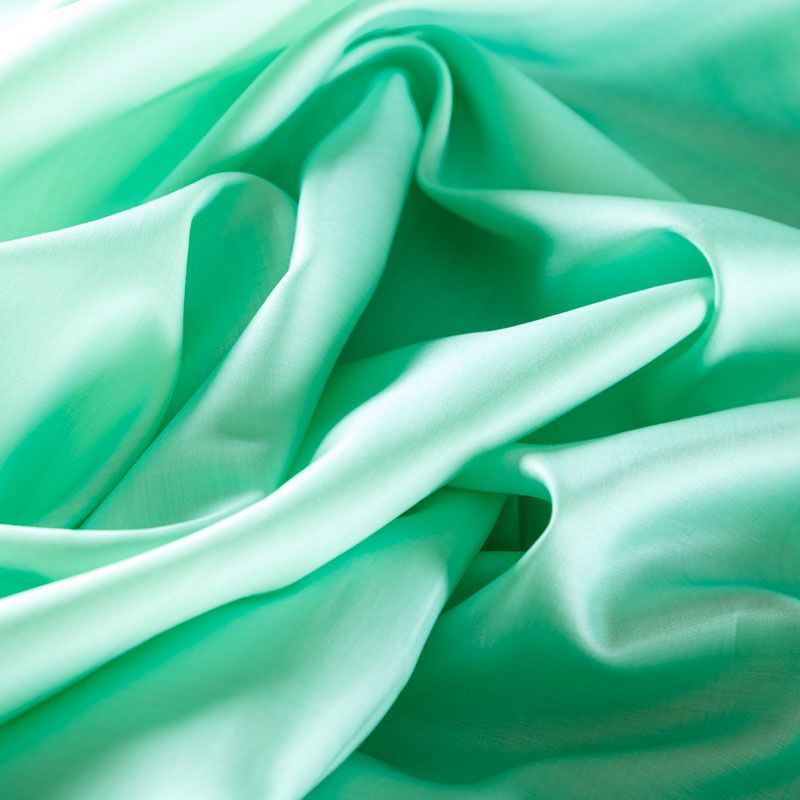 Итальянский хлопковый батист с добавлением шелка в зеленом оттенке, тонкий, легкий, полупрозрачный, приятный на ощупь, нежный, хорошо и мягко драпируется, летящий. Батист подойдёт для модных блуз с объёмными рукавами, летних платьев и сарафанов с длинной летящей юбкой, прозрачных рубашек, декорированных объёмными бантами, детской одежды.