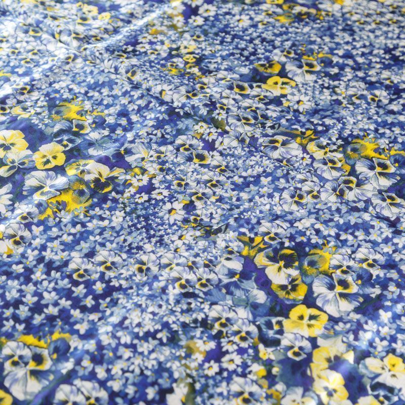 Очень красивый и нежный шелковый батист с добавлением хлопка в синем цвете с цветочным принтом. Ткань тонкая, мягкая и легкая, но достаточно плотная, не прозрачная, ее прикосновения к телу очень приятны, в изделии из него будет комфортно как в жару, так и в прохладную погоду. Лицевая сторона гладкая, с легким сатиновым блеском. Прекрасно подойдет для пошива летнего сарафана, платья, блузки, топа, туники, костюма в пижамном стиле, широких брюк или юбки.
