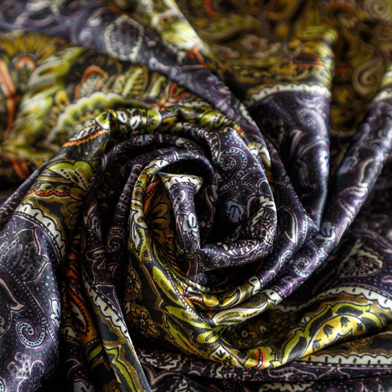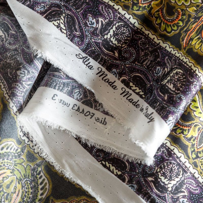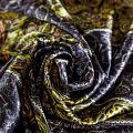Итальянский атласный шелк с в серо-оливковых оттенках с насыщенным узором. Ткань тонкая, не просвечивает, отлично драпируется, тянется за счет эластана в составе, легкая и струящаяся. Идеально подойдет для пошива платьев и сарафанов расклешенных моделей, с воланами, летящих юбок, топов, блузки, костюма в пижамном стиле.
