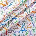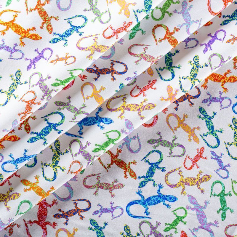 Итальянский шелк с матовой лицевой поверхностью и атласной изнанкой со стилизованными цветными ящерками на белом фоне, тонкий, слегка прозрачный, отлично драпируется, легкий и струящийся. Идеально подойдет для пошива платьев и сарафанов расклешенных моделей, с воланами, летящих юбок, топов, блузки, костюма в пижамном стиле.