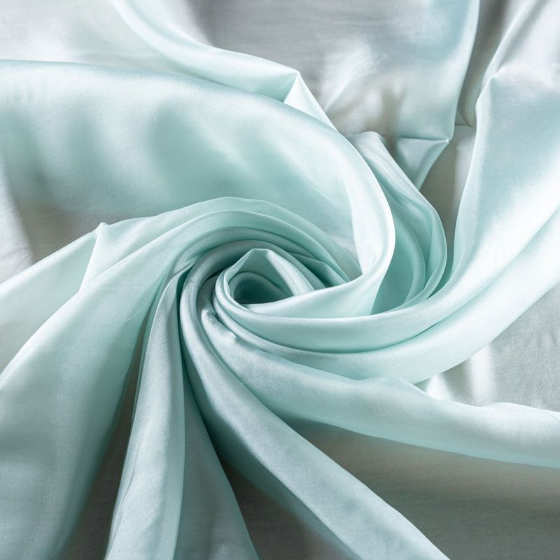 Очень красивый и нежный шелк благородного светло-голубого оттенка. Ткань тонкая, мягкая и легкая, не много просвечивает, ее прикосновения к телу очень приятны, в изделии из него будет комфортно как в жару, так и в прохладную погоду. Лицевая сторона гладкая, с легким сатиновым блеском. Прекрасно подойдет для пошива летнего сарафана, платья, блузки, топа, туники, костюма в пижамном стиле, широких брюк или юбки.