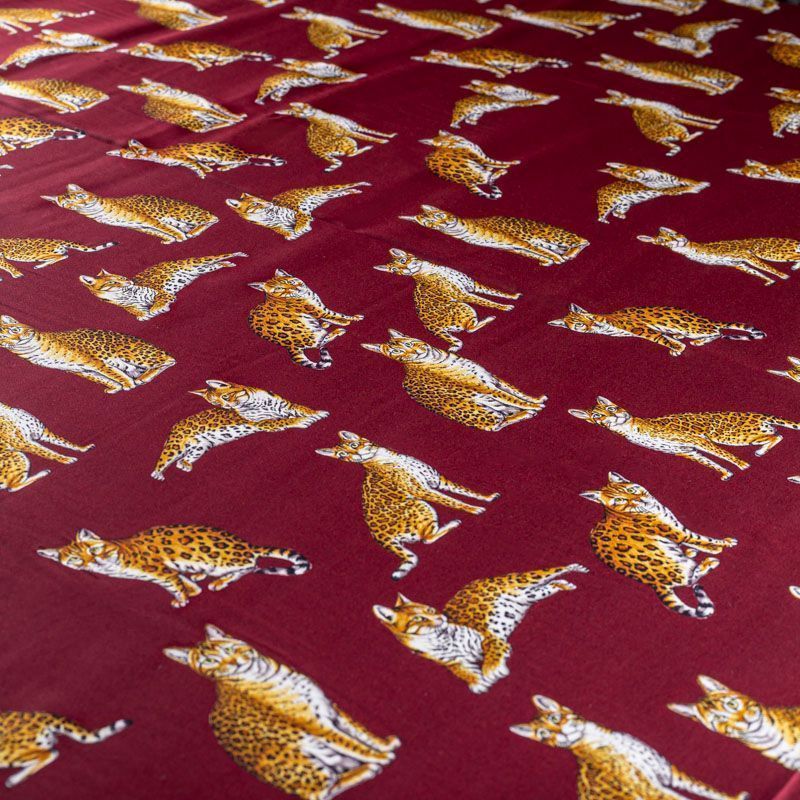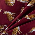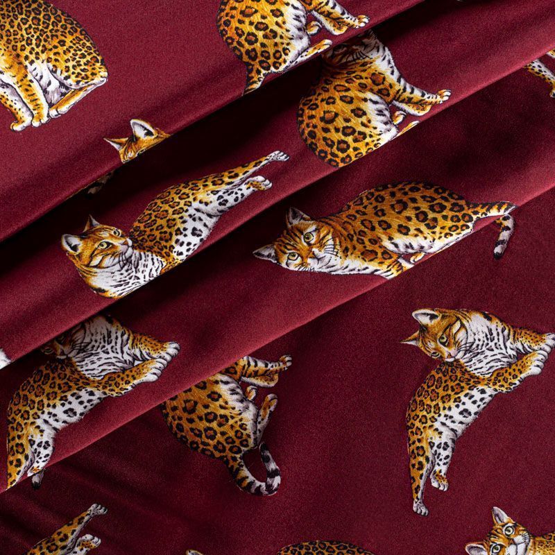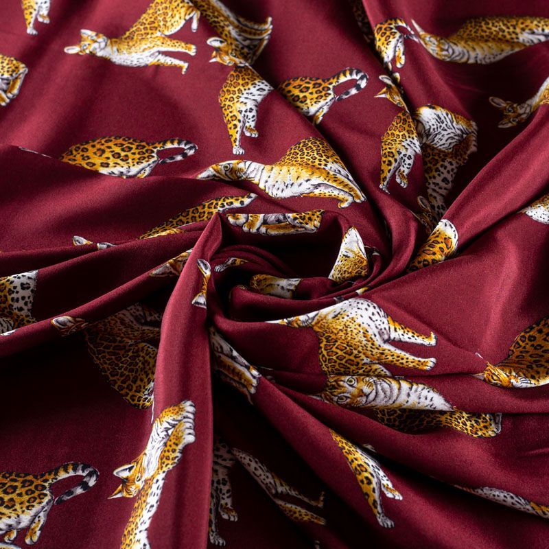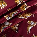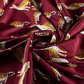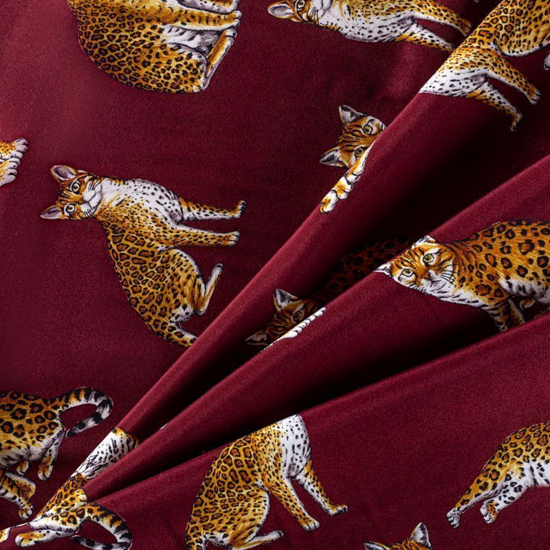 Итальянский матовый шелк бордового оттенка с узнаваемым принтом диких кошек от известного бренда. Ткань тонкая, не просвечивается, отлично драпируется, легкая и струящаяся, тянется за счет эластана в составе, лицевая сторона креповая, изнанка - атласная. Идеально подойдет для пошива платьев и сарафанов расклешенных моделей, с воланами, рюшами, летящих юбок, топов, блузки, рубашки, костюма в пижамном стиле.