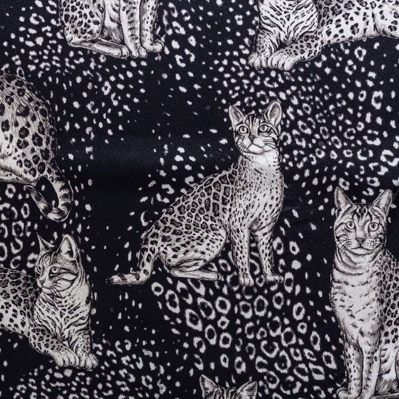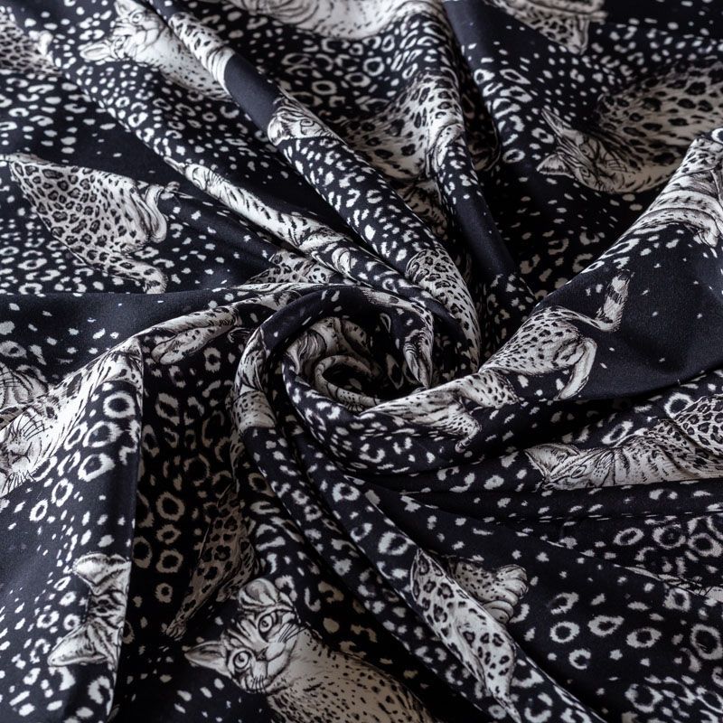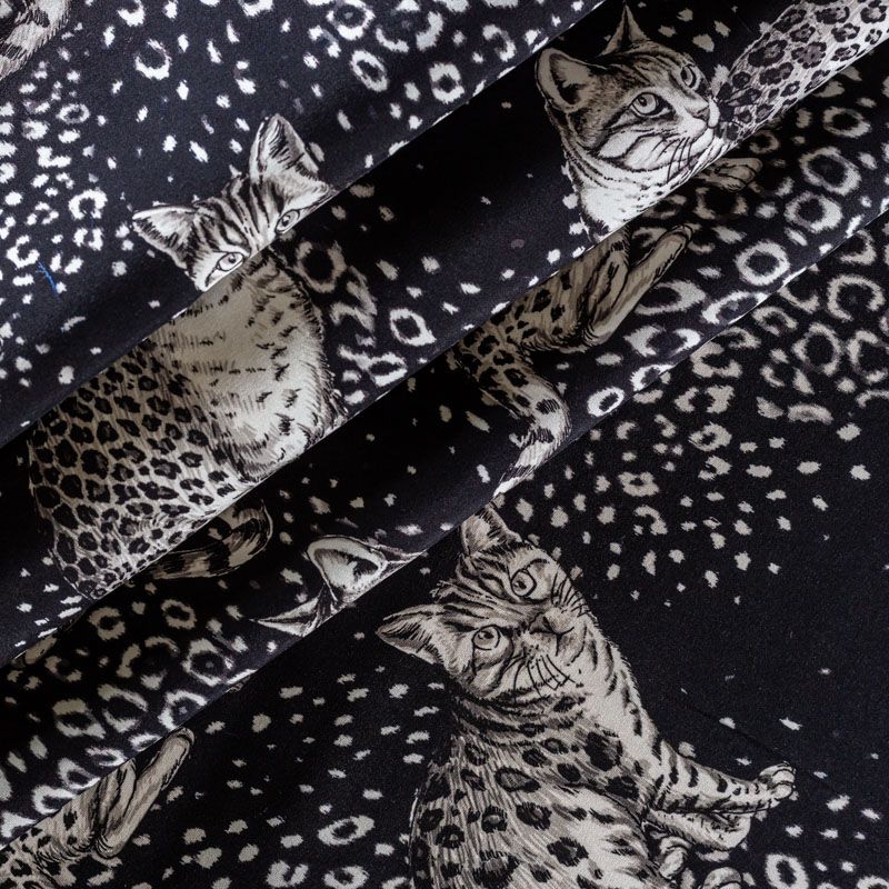 Итальянский матовый шелк черного цвета с узнаваемым принтом диких кошек от известного бренда. Ткань тонкая, не просвечивается, отлично драпируется, легкая и струящаяся, тянется за счет эластана в составе, лицевая сторона креповая, изнанка - атласная. Идеально подойдет для пошива платьев и сарафанов расклешенных моделей, с воланами, рюшами, летящих юбок, топов, блузки, рубашки, костюма в пижамном стиле.