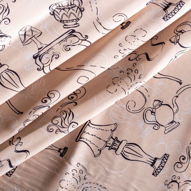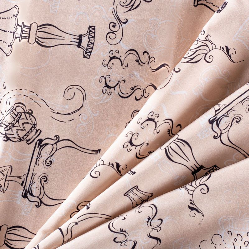 Итальянский матовый шелк бежевого оттенка с узнаваемым принтом. Ткань тонкая, не просвечивается, отлично драпируется, легкая и струящаяся, тянется за счет эластана в составе, лицевая сторона креповая, изнанка - атласная. Идеально подойдет для пошива платьев и сарафанов расклешенных моделей, с воланами, рюшами, летящих юбок, топов, блузки, рубашки, костюма в пижамном стиле.