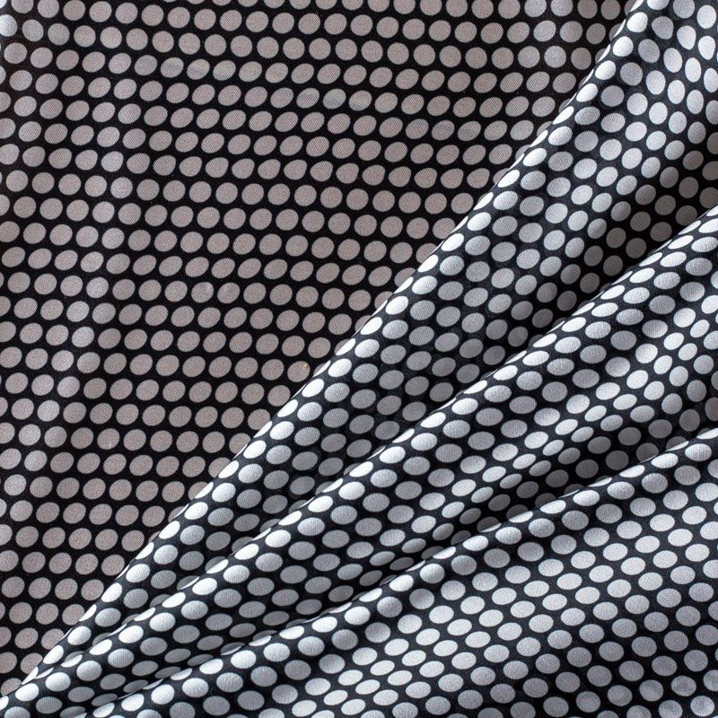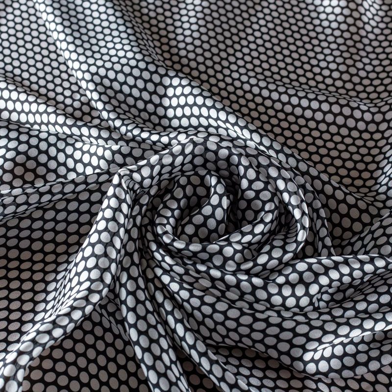 Итальянский атласный шелк с классическим принтом "в горошек", тонкий, слегка прозрачный, отлично драпируется, легкий и струящийся. Идеально подойдет для пошива платьев и сарафанов расклешенных моделей, с воланами, летящих юбок, топов, блузки, костюма в пижамном стиле.