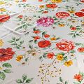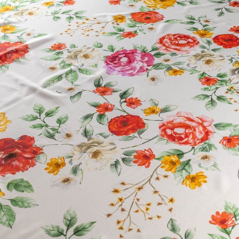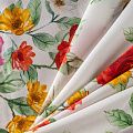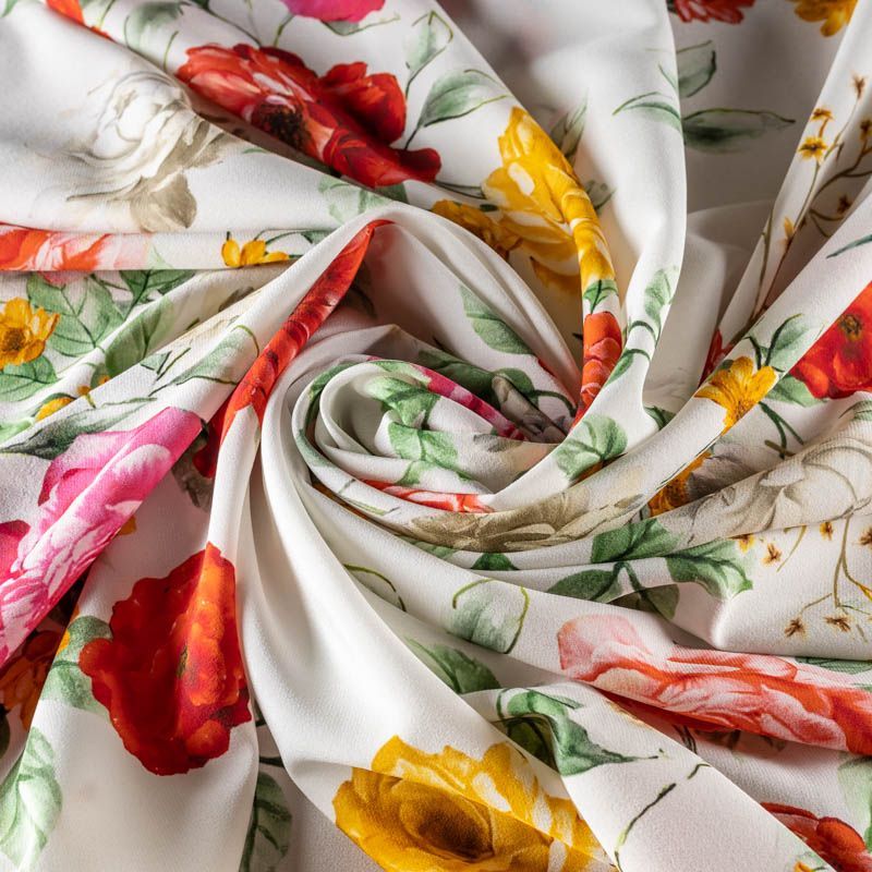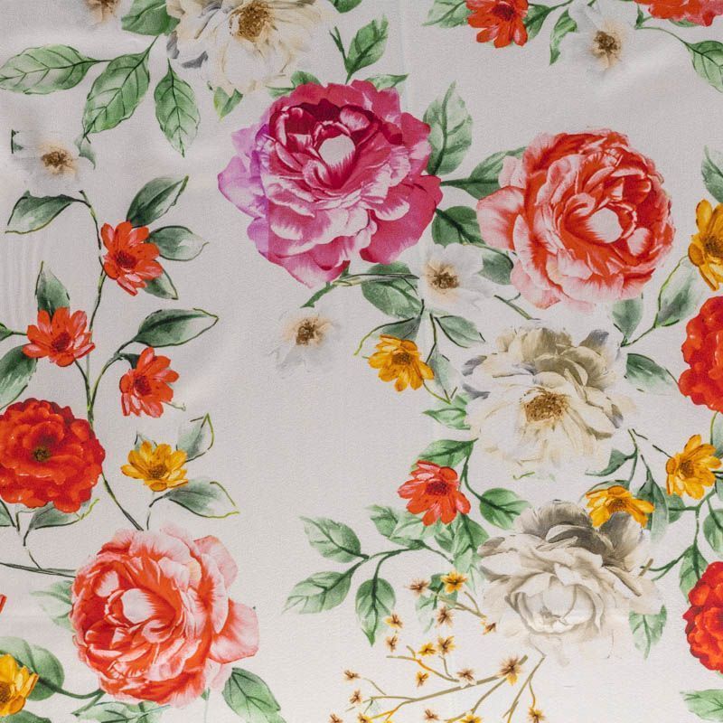 Итальянский матовый шелк с цветочным ярким принтом на белом фоне, тонкий, слегка прозрачный, отлично драпируется, тянется за счет эластана в составе, легкий и струящийся с креповой поверхностью. Идеально подойдет для пошива платьев и сарафанов расклешенных моделей, с воланами, летящих юбок, топов, блузы, костюма в пижамном стиле.