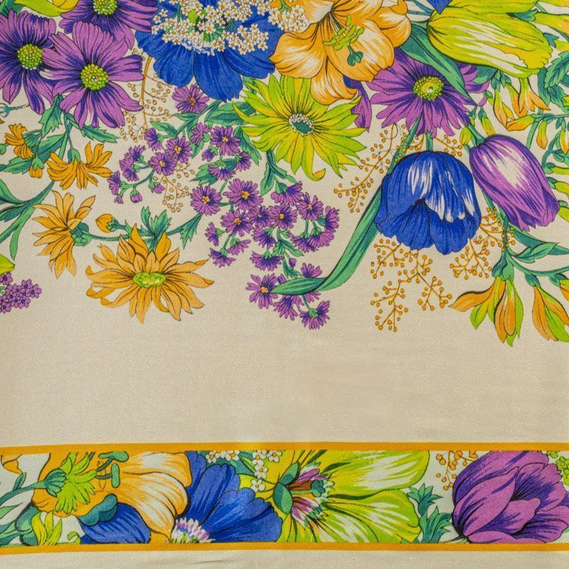 Итальянский атласный шелк с ярким цветным растительным принтом. Вдоль кромки оформлен цветными полосами в тон рисунку. Можно использовать в изделии по длине ткани и объемом. Ткань средней плотности, не просвечивает, струится, хорошо драпируется, не много тянется за счет эластана в составе. Поверхность глядкая, имеет благородный сатиновый блеск. Подойдет для смелых образов: летних платьев и сарафанов, как летящих фасонов, так и скроенных по косой, накидок, юбок, блузок, костюмов, широких брюк, домашней одежды.