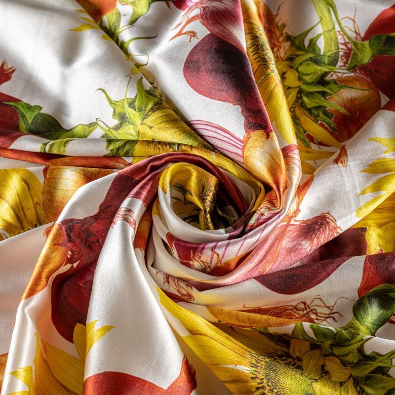 Итальянский атласный шелк с не тривиальным реалистичным растительным принтом. Ткань средней плотности, не просвечивает, струится, хорошо драпируется. Поверхность глядкая, имеет благородный сатиновый блеск. Подойдет смелых образов: летних платьев и сарафанов, как летящих фасонов, так и скроенных по косой, накидок, юбок, блузок, костюмов, широких брюк, домашней одежды.