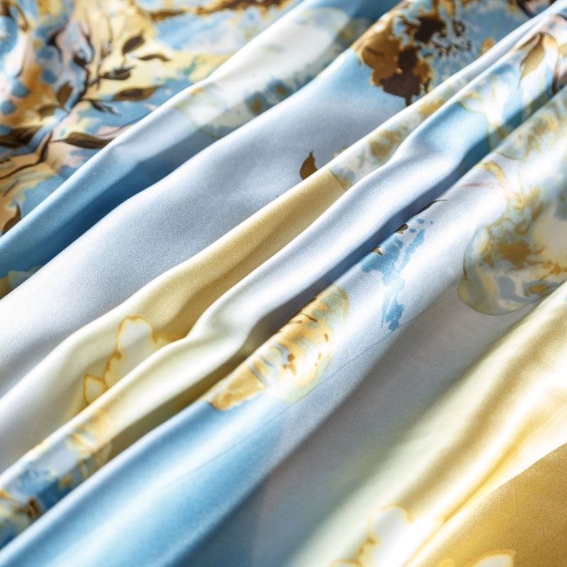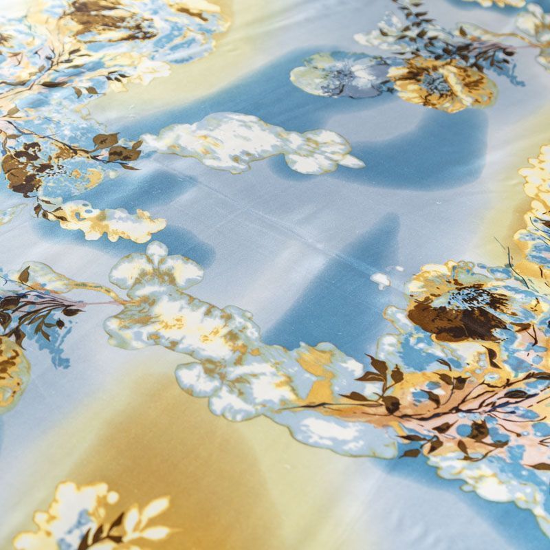 Итальянский атласный шелк с красивым цветочным принтом. Ткань средней плотности, не просвечивает, струится, хорошо драпируется. Поверхность глядкая, имеет благородный сатиновый блеск. Подойдет смелых образов: летних платьев и сарафанов, как летящих фасонов, так и скроенных по косой, накидок, юбок, блузок, костюмов, широких брюк, домашней одежды.