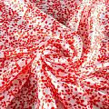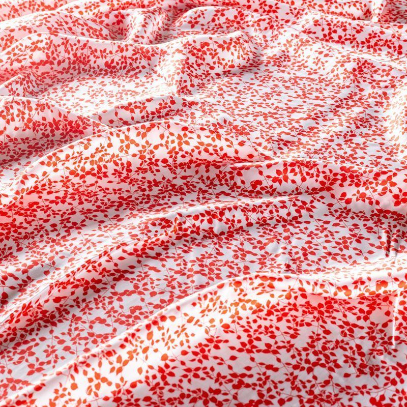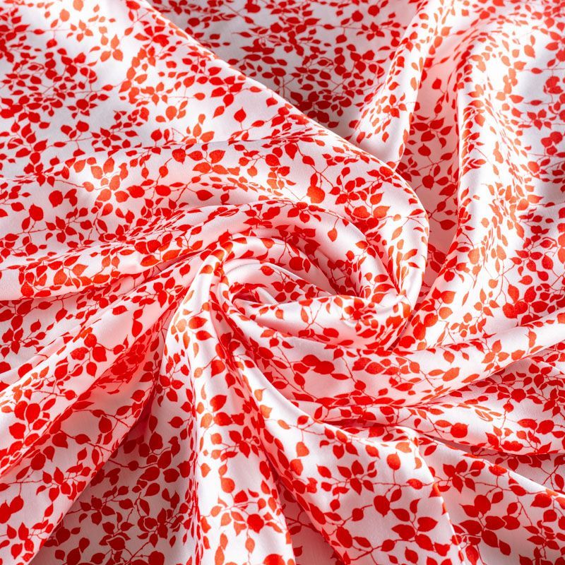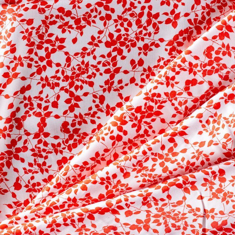 Итальянский плательно-блузочный штапель с добавлением шелка белого цвета с нежным растительным принтом кораллового оттенка. Мягкий, нежный, пластичный, шелковистый на ощупь, хорошо драпируется, практичный. Особенно актуален летом, он очень легкий, обволакивающий прохладой. Идеален для пошива летней детской одежды, сарафанов, платьев, юбок, блузок, домашней одежды: халатов, ночной пижамы.