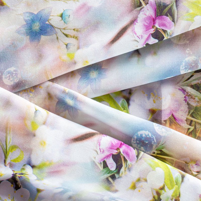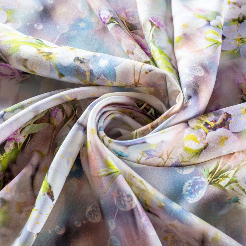 Плательно-блузочный штапель с добавлением шелка с флористическим принтом. Ткань очень мягкая, нежная, пластичная, шелковистая на ощупь, хорошо драпируется, практичная. Особенно актуальна летом, шелк-штапель очень легкий, обволакивающий прохладой. Идеален для пошива летней детской одежды, сарафанов, платьев, юбок, блузок, домашней одежды: халатов, ночной пижамы.