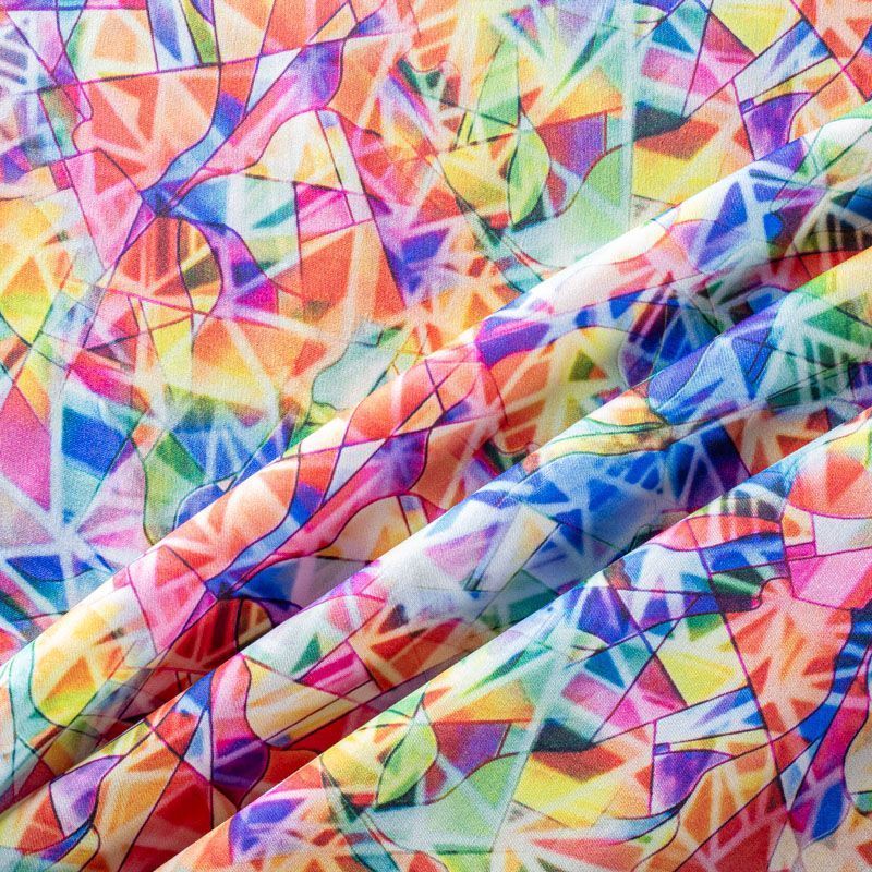 Плательно-блузочный штапель с добавлением шелка с ярким геометрическим принтом. Ткань очень мягкая, нежная, пластичная, шелковистая на ощупь, хорошо драпируется, практичная. Особенно актуальна летом, шелк-штапель очень легкий, обволакивающий прохладой. Идеален для пошива летней детской одежды, сарафанов, платьев, юбок, блузок, домашней одежды: халатов, ночной пижамы.