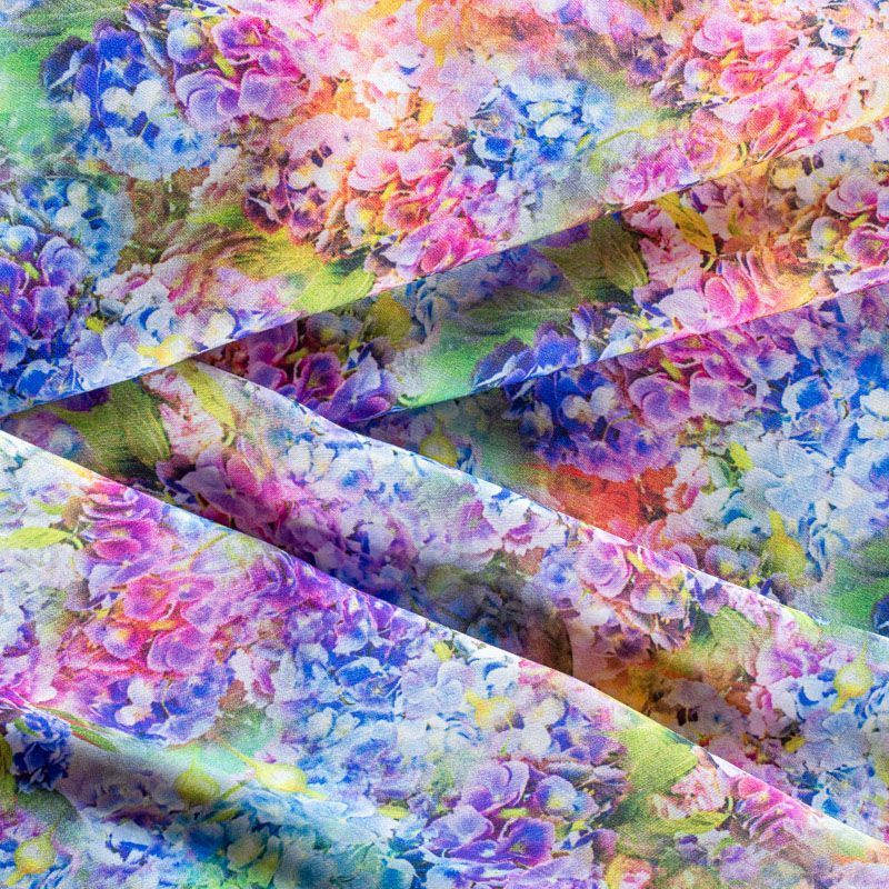 Плательно-блузочный штапель с добавлением шелка с ярким цветочным принтом. Ткань очень мягкая, нежная, пластичная, шелковистая на ощупь, хорошо драпируется, практичная. Особенно актуальна летом, шелк-штапель очень легкий, обволакивающий прохладой. Идеален для пошива летней детской одежды, сарафанов, платьев, юбок, блузок, домашней одежды: халатов, ночной пижамы.
