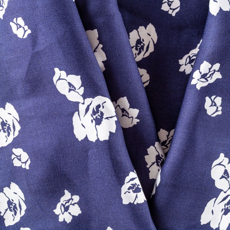 Плательно-блузочный штапель с добавлением шелка с белым цветочным принтом на темно-синем фоне. Ткань очень мягкая, нежная, пластичная, шелковистая на ощупь, хорошо драпируется, практичная. Особенно актуальна летом, шелк-штапель очень легкий, обволакивающий прохладой. Идеален для пошива летней детской одежды, сарафанов, платьев, юбок, блузок, домашней одежды: халатов, ночной пижамы.