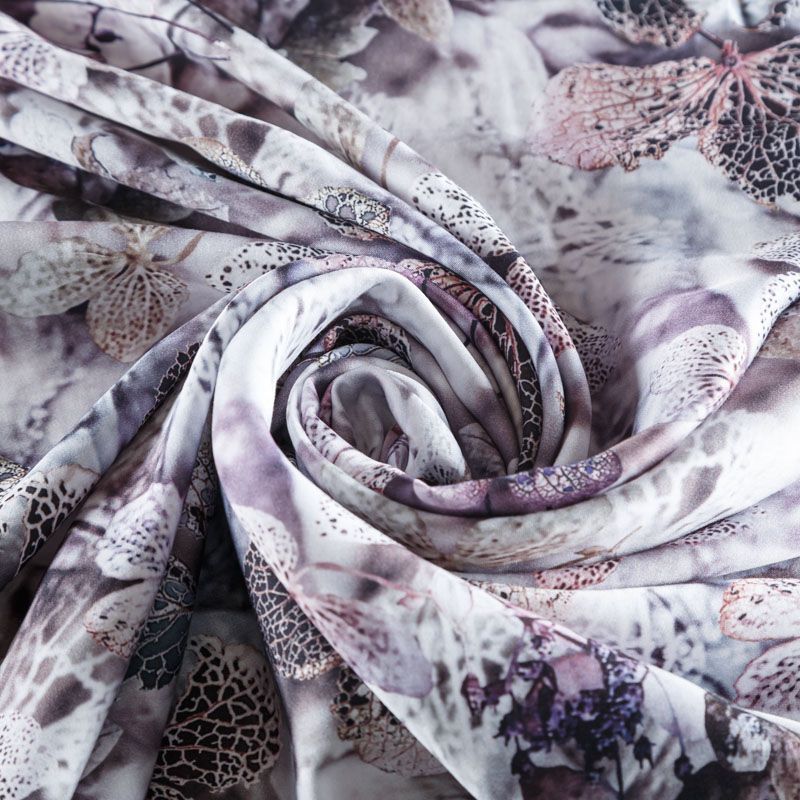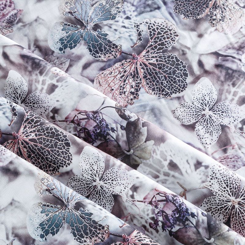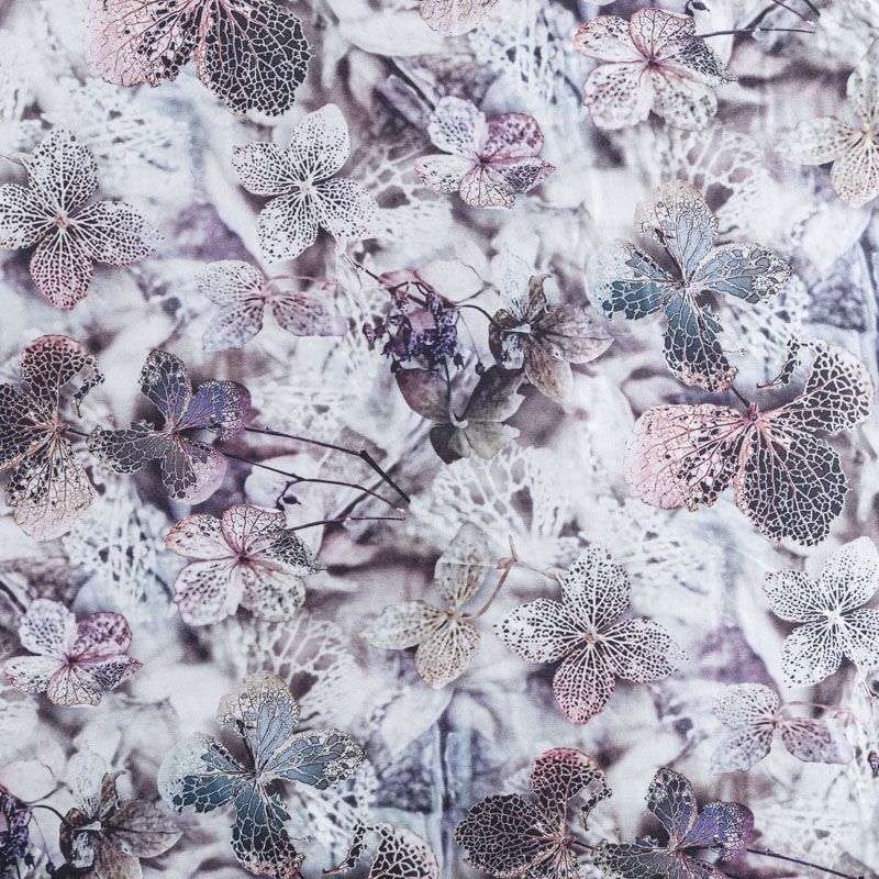 Плательно-блузочный штапель с добавлением шелка бело-лиловых оттенках с реалистичным растительным принтом. Мягкий, нежный, пластичный, шелковистый на ощупь, хорошо драпируется, практичный. Особенно актуален летом, он очень легкий, обволакивающий прохладой. Идеален для пошива летней детской одежды, сарафанов, платьев, юбок, блузок, домашней одежды: халатов, ночной пижамы.