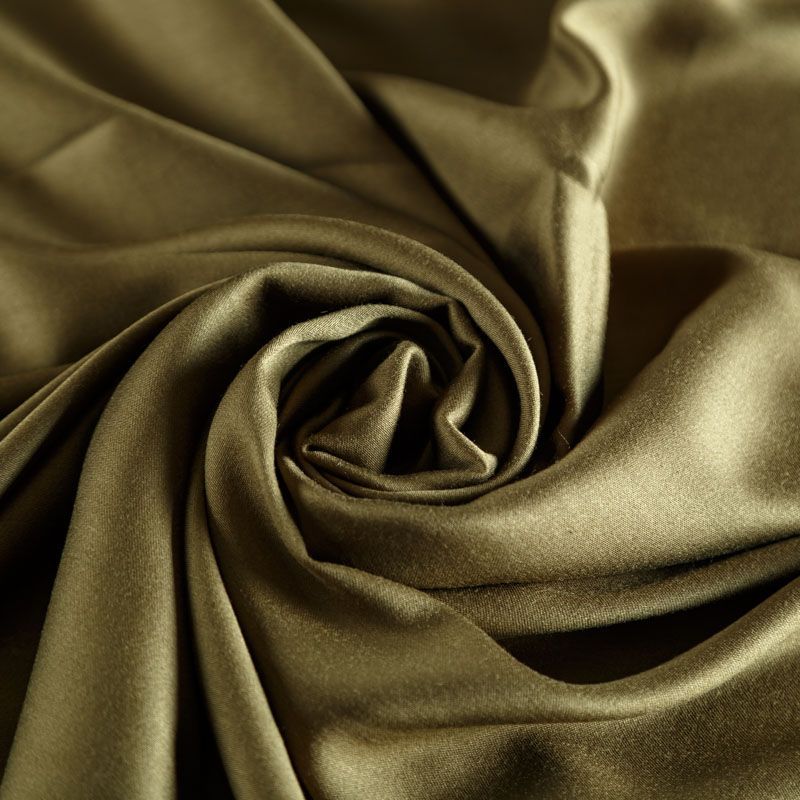 Плательно-блузочный штапель с добавлением шелка в оливково-зеленом оттенке. Мягкий, нежный, пластичный, шелковистый на ощупь, хорошо драпируется, практичный, тянется за счет эластана в составе. Особенно актуален летом, он очень легкий, обволакивающий прохладой. Идеален для пошива летней детской одежды, сарафанов, платьев, юбок, блузок, домашней одежды: халатов, ночной пижамы.