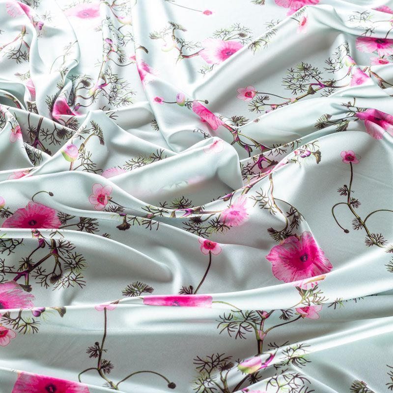 Тонкая, легкая, струящаяся ткань, не просвечивает, очень нежная и прятная к телу, обладает благородным атласным блеском, хорошо драпируется, не тянется. Идеально подойдет для пошива блузок, платьев и юбок, а также топов, платков, домашней одежды.