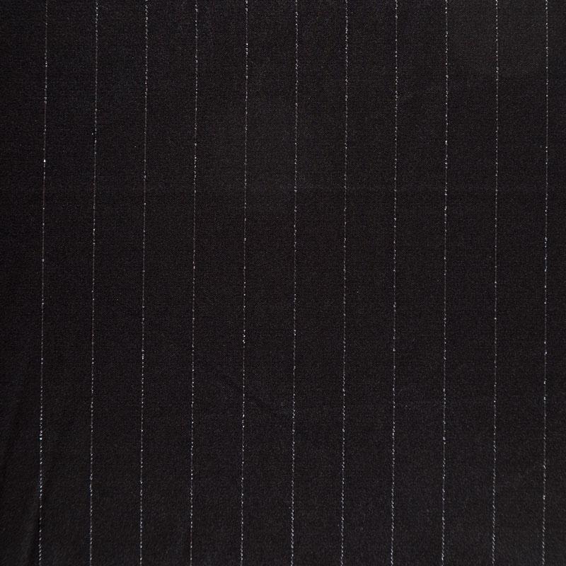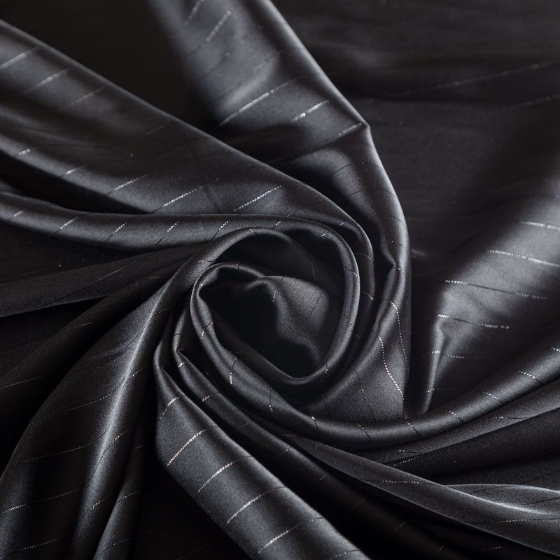 Тонкая, легкая, струящаяся ткань, декорированная тонкими вертикальными полосками люресовой нити, не просвечивает, очень нежная и прятная к телу, обладает благородным атласным блеском, хорошо драпируется, тянется за счет эластана в составе. Идеально подойдет для пошива блузок, платьев и юбок, а также топов, платков, домашней одежды.