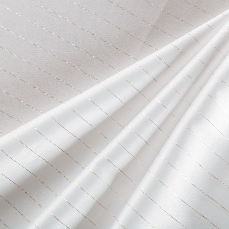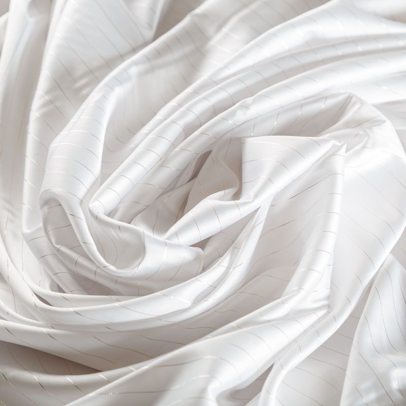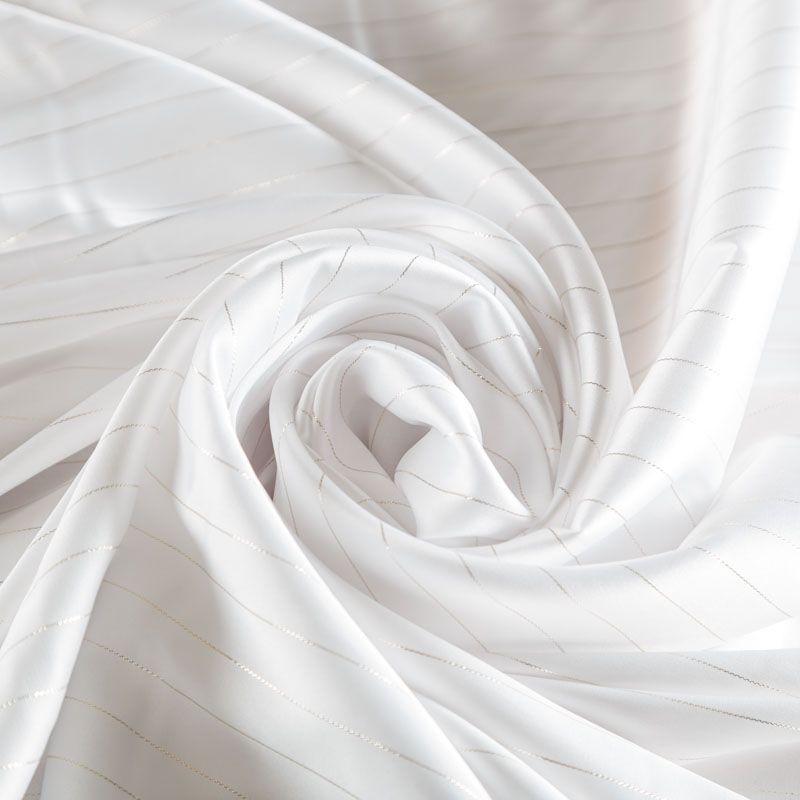 Тонкая, легкая, струящаяся ткань, декорированная тонкими вертикальными полосками люресовой нити, не просвечивает, очень нежная и прятная к телу, обладает благородным атласным блеском, хорошо драпируется, тянется за счет эластана в составе. Идеально подойдет для пошива блузок, платьев и юбок, а также топов, платков, домашней одежды.