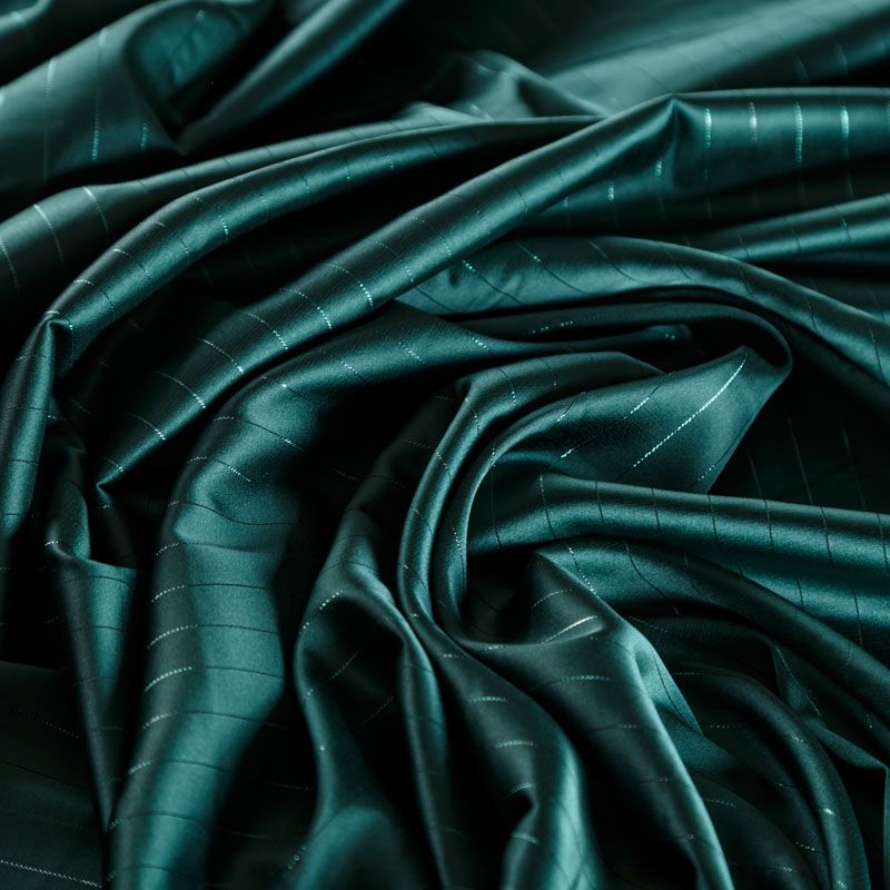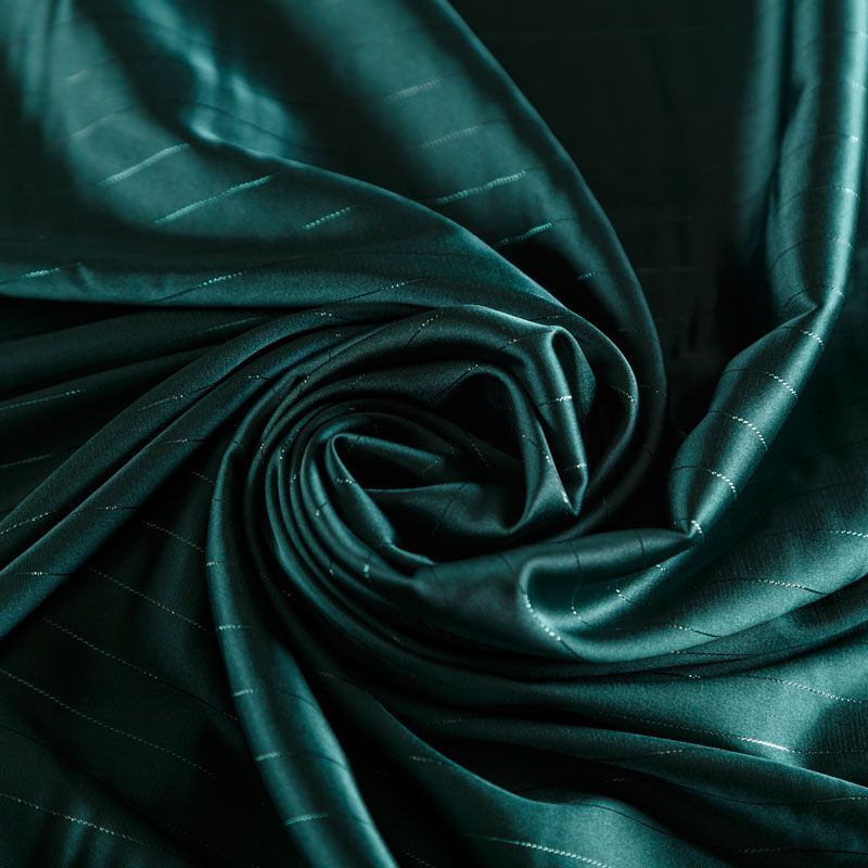 Тонкая, легкая, струящаяся ткань, декорированная тонкими вертикальными полосками люресовой нити, не просвечивает, очень нежная и прятная к телу, обладает благородным атласным блеском, хорошо драпируется, тянется за счет эластана в составе. Идеально подойдет для пошива блузок, платьев и юбок, а также топов, платков, домашней одежды.
