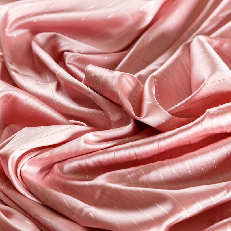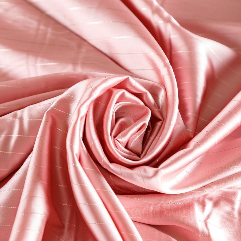 Тонкая, легкая, струящаяся ткань, декорированная тонкими вертикальными полосками люресовой нити, не просвечивает, очень нежная и прятная к телу, обладает благородным атласным блеском, хорошо драпируется, тянется за счет эластана в составе. Идеально подойдет для пошива блузок, платьев и юбок, а также топов, платков, домашней одежды.