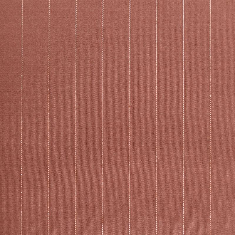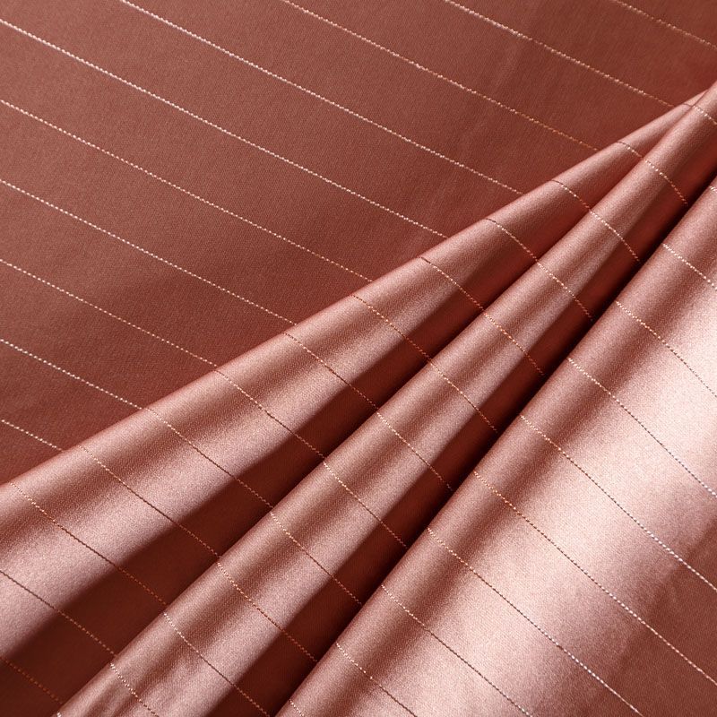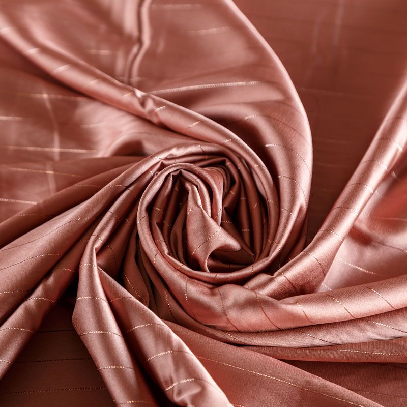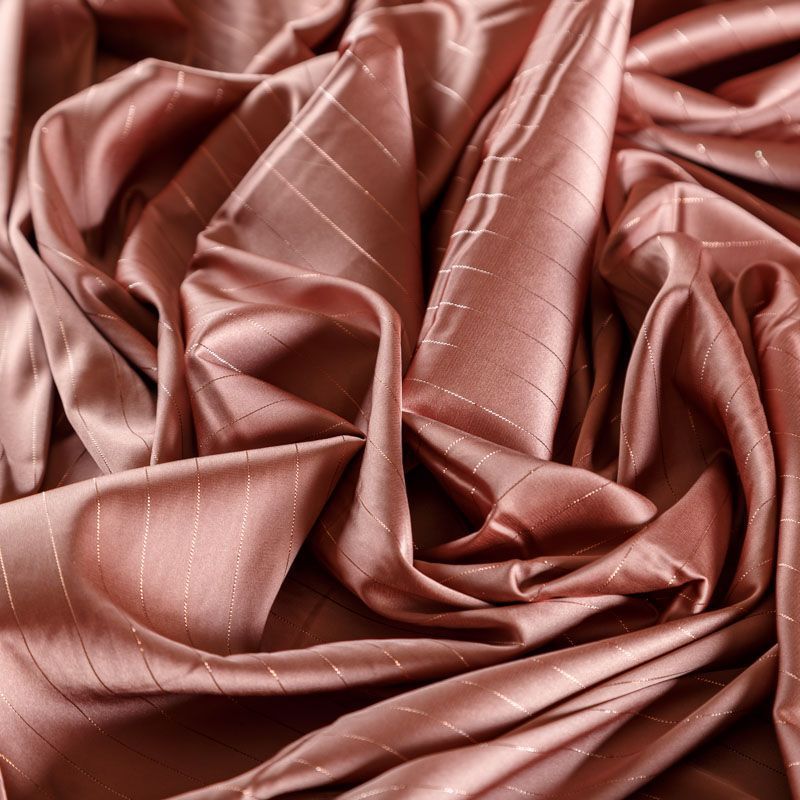 Тонкая, легкая, струящаяся ткань, декорированная тонкими вертикальными полосками люресовой нити, не просвечивает, очень нежная и прятная к телу, обладает благородным атласным блеском, хорошо драпируется, тянется за счет эластана в составе. Идеально подойдет для пошива блузок, платьев и юбок, а также топов, платков, домашней одежды.