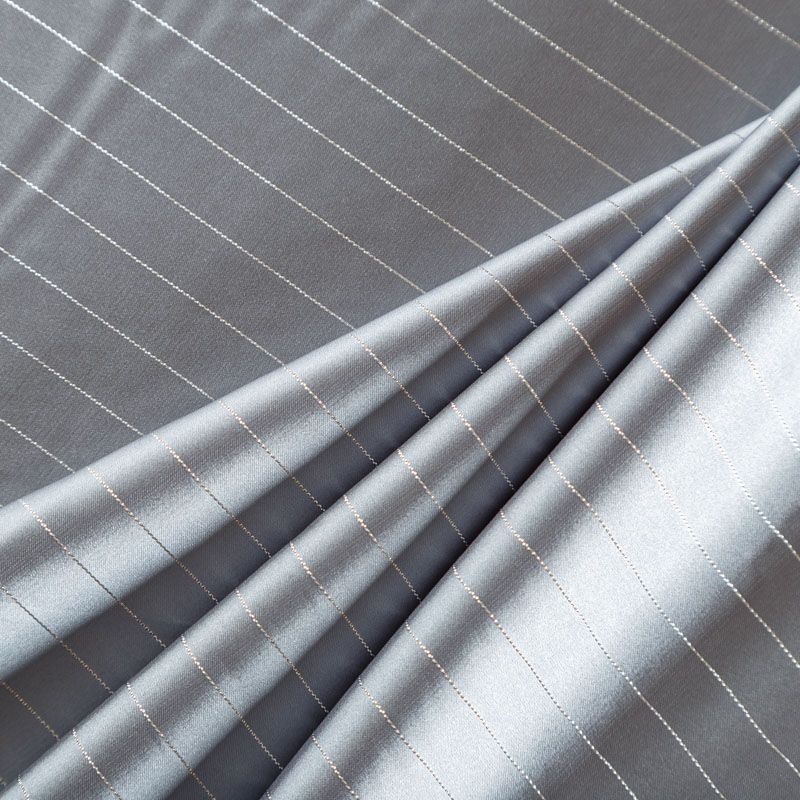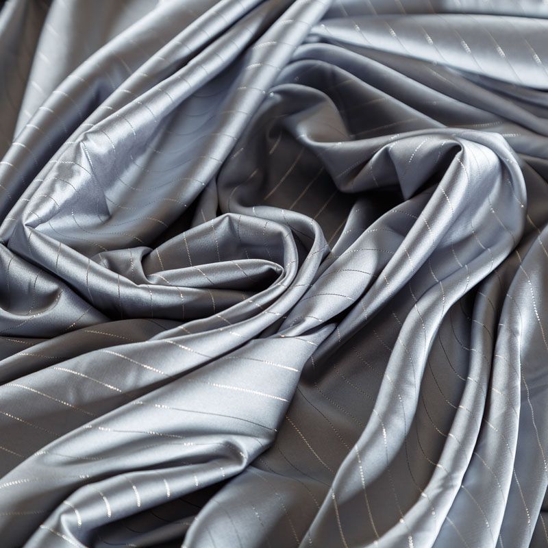 Тонкая, легкая, струящаяся ткань, декорированная тонкими вертикальными полосками люресовой нити, не просвечивает, очень нежная и прятная к телу, обладает благородным атласным блеском, хорошо драпируется, тянется за счет эластана в составе. Идеально подойдет для пошива блузок, платьев и юбок, а также топов, платков, домашней одежды.