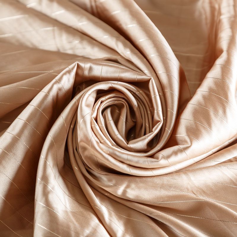 Тонкая, легкая, струящаяся ткань, декорированная тонкими вертикальными полосками люресовой нити, не просвечивает, очень нежная и прятная к телу, обладает благородным атласным блеском, хорошо драпируется, тянется за счет эластана в составе. Идеально подойдет для пошива блузок, платьев и юбок, а также топов, платков, домашней одежды.