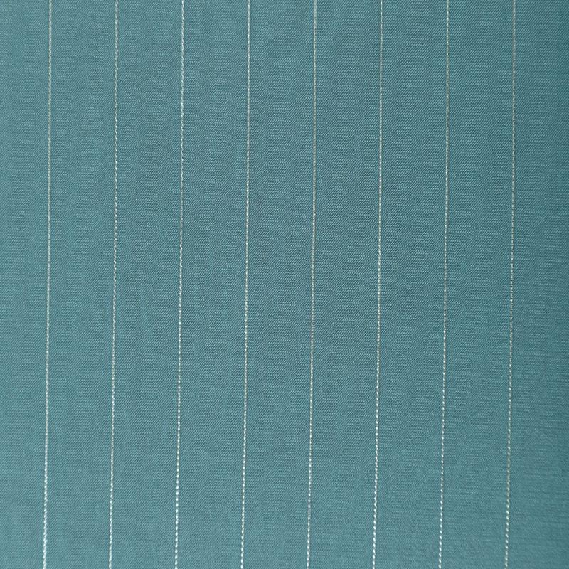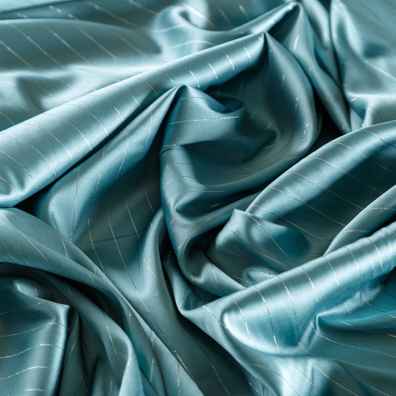 Тонкая, легкая, струящаяся ткань, декорированная тонкими вертикальными полосками люресовой нити, не просвечивает, очень нежная и прятная к телу, обладает благородным атласным блеском, хорошо драпируется, тянется за счет эластана в составе. Идеально подойдет для пошива блузок, платьев и юбок, а также топов, платков, домашней одежды.
