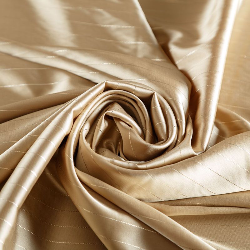 Тонкая, легкая, струящаяся ткань, декорированная тонкими вертикальными полосками люресовой нити, не просвечивает, очень нежная и прятная к телу, обладает благородным атласным блеском, хорошо драпируется, тянется за счет эластана в составе. Идеально подойдет для пошива блузок, платьев и юбок, а также топов, платков, домашней одежды.