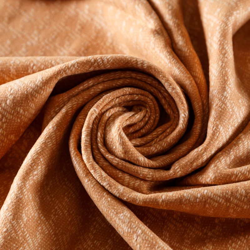 Итальянская фактурная шерсть в карамельном оттенке. Ткань хорошо держит форму, приятная на ощупь, гибкая, средней толщины, при этом высокой плотности. Подойдет для пошива теплого костюма, юбки, пальто, куртки, жакета, парки, кейпа, жакета или пончо.