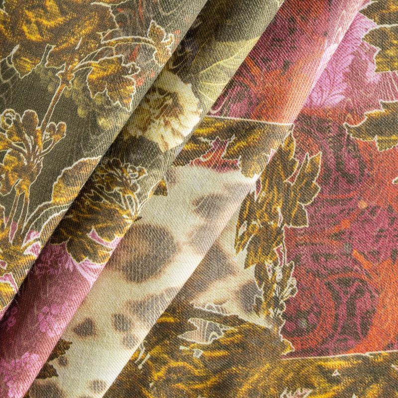 Итальянская плательная шерсть оттенка хаки со сложным принтом, сочетающим в себе флористическую и анималистическую темы. Ткань тонкая, мягкая и пластичная, отлично драпируется. Поверхность матовая с твиловым плетением нитей. Прекрасно подойдет для создания осенних платьев, теплых туник, юбок, кофточек, а также аксессуаров, таких как палантины, шарфы, платки.