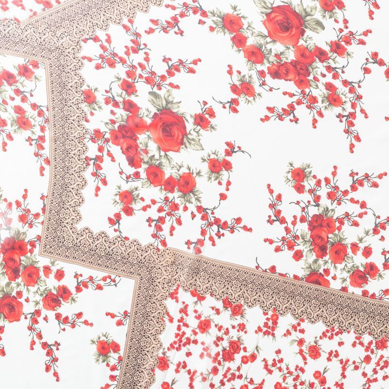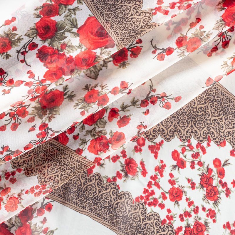 Шифон белого оттенка с мелким цветочным принтом и имитацией кружева. Струящийся, летящий, воздушный, полупрозрачный. На ощупь мягкий и приятный.Подойдет для пошива тончайших воздушных блуз, изумительных платьев со сборками и воланами и элегантных шарфов.