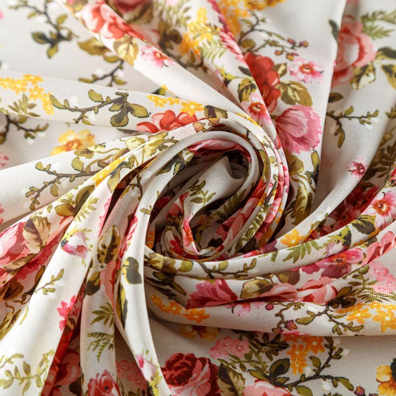 Шифон молочного оттенка с растительным принтом. Струящийся, летящий, воздушный, полупрозрачный. На ощупь мягкий и приятный. Подойдет для пошива тончайших воздушных блуз, изумительных платьев со сборками и воланами и элегантных шарфов.